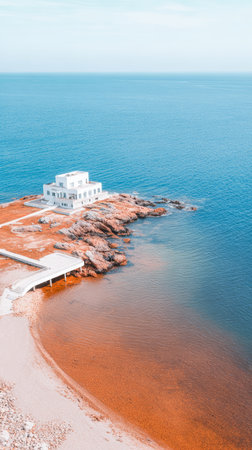 A house stands on a rocky area by the water. The location features clear skies and a bright sea. The shore has a gentle curve with sandy and rocky parts showing.