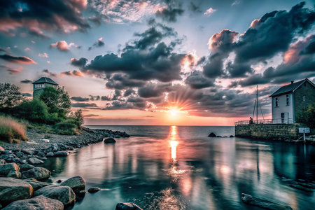 A lonely cottage on a ridge of land on the coast. Ai generated.