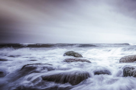 Long exposure seascape with waves crashing on rocks. Long exposure shot.
