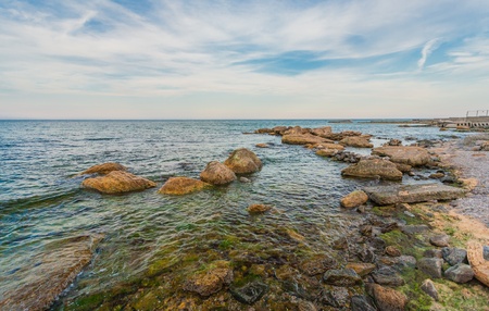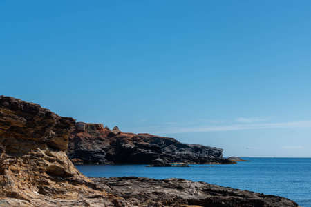 Rocky shore of the Mediterranean Sea in Spain on a beautiful sunny day, calm water