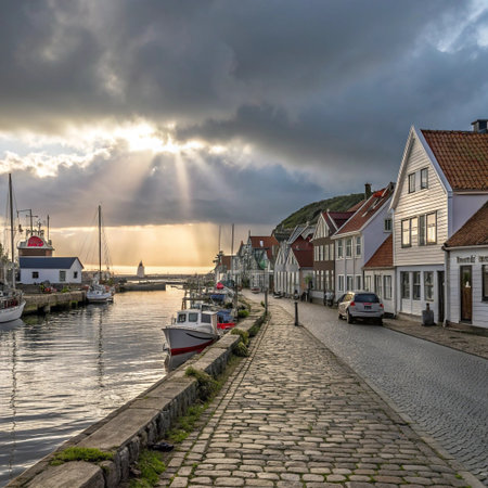 A serene coastal town at sunrise with fishing boats in the harbor, pastel-colored houses along the shore, and gulls flying overhead. The peaceful scene captures maritime charm.