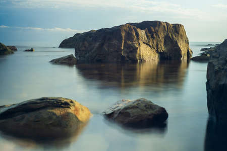 Sea rocks in seawater. The water creates a fog due to the long exposure time. Beautiful reflection in the water. Blue sky with clouds in the background