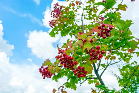 Viburnum berry in autumn garden on sunny day. Blue sky. Landscape.