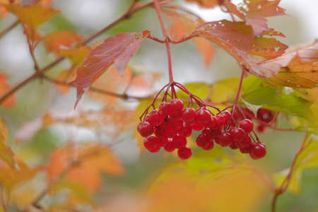 A cluster of red berries of guelder rose on a blurry background in the fall