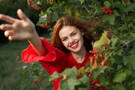 smiling woman red lips posing nature fresh air summer