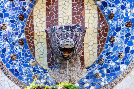 Detail of the head in the second Fountain of the famous Parc Güell designed by the architect Gaudà in the city of Barcelona, located on Carmel Hill, in Barcelona, Catalonia, Spain