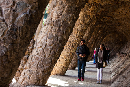 BARCELONA, SPAIN - DECEMBER 8, 2013: Tourists visiting the famous Park Guell in Barcelona, Catalonia, Spain, designed by Antoni Gaudi, renowned architect representative of Catalan modernism