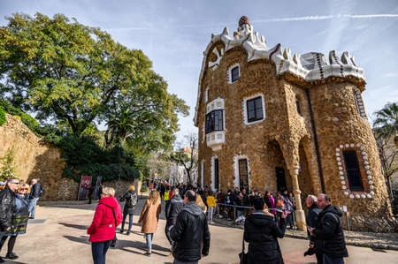 Park Guell by architect Antoni Gaudi . Designed houses, tourists. 03.01.2020 Barcelona, Spain.