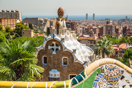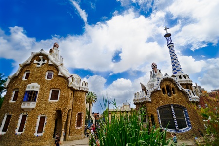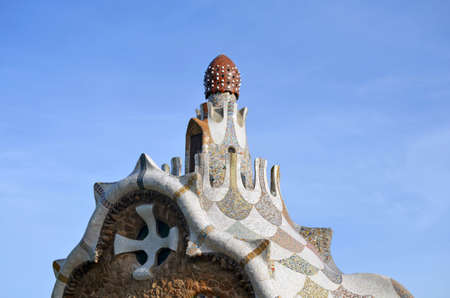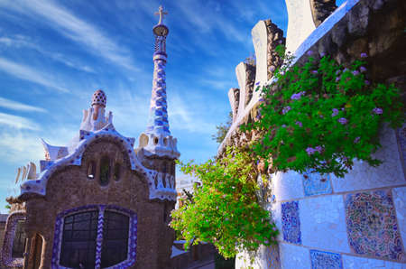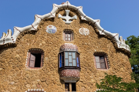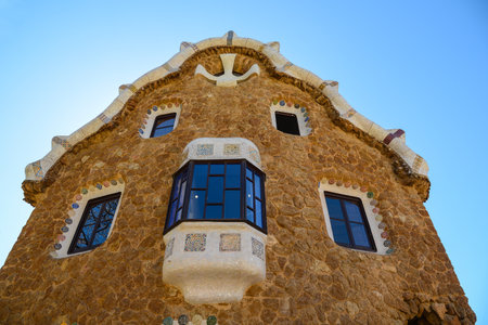 Fairytale gingerbread house in Park Guell designed by Antoni Gaudi in Barcelona, Spain. Sunny summer day in city