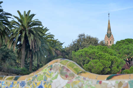 Park Güell located on Carmel Hill, in Barcelona. Vibrantly colored tiles