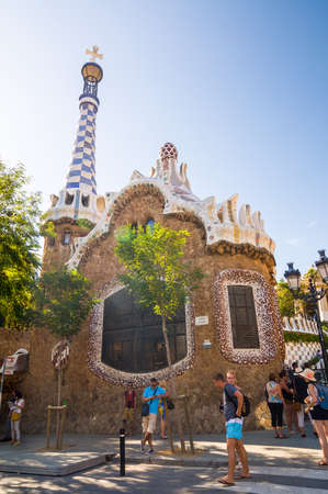 Barcelona, Spain - September 20, 2014: Park Guell by architect Antoni Gaudi in Barcelona, Catalonia, Spain. Pavilion at the entrance of the park.