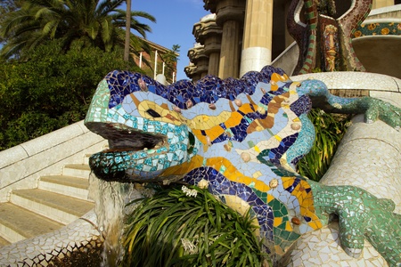 Famous mosaic lizard or salamander fountain in Park Guell. Mosaic sculpture in the Parc Güell designed by Antoni Gaudà located on Carmel Hill, Barcelona, Spain.