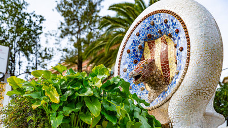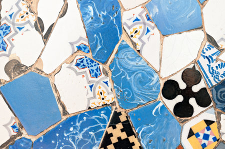 Barcelona, Spain - September 22, 2021: Detail of the tiles placed in Paruqe Güell with the trancadis technique designed by Antonio Gaudi
