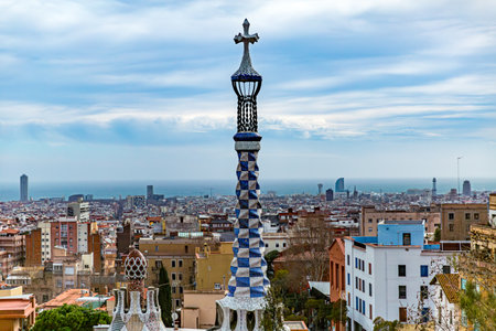 BARCELONA, SPAIN - APRIL 23, 2016: Park Guell by architect Antoni Gaudi. Panorama of city of Barcelona.