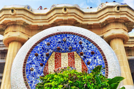 BARCELONA, SPAIN - JUNE 10: Sign of The Park Guell close-up on June 10, 2011 in Barcelona, Spain. Park Guell is the famous park was designed by Antoni Gaudi and built in the years 1900 to 1914.