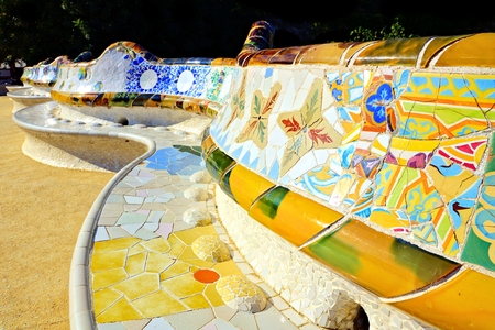 The longest bench with mosaics in the Park Guell in Barcelona, ??Spain