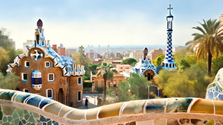 A stunning view of a mosaic tiled park in a vibrant city under a blue sky