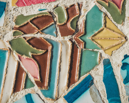 Colorful ceramic mosaic closeup on a bench of park Guell, designed by Antonio Gaudi, in Barcelona, Spain