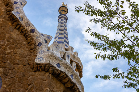 Closeup of entrance pavilion tower of the Park Guell, designed by Antonio Gaudi, in Barcelona, Spain