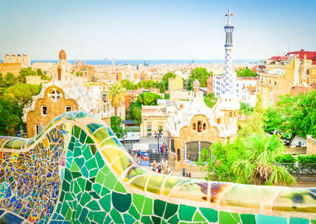 Gaudi mosaic bench and cityscape of Barcelona from park Guell, famous view of Barcelona, Spain, toned