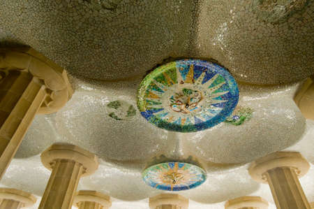 huge columns and mosaic ceiling in famous Sala Hipostila in Park Guell, Barcelona which were designed by modernism architect Antoni Gaudi