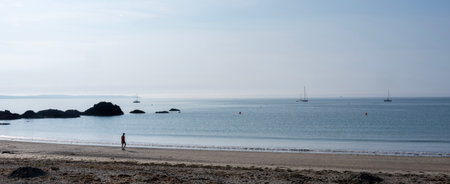 An unrecognizabe woman standing on the edge of cliff and admiring Guernsey, Channel Islands