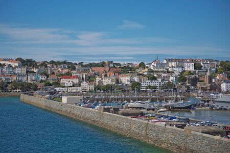 ST. PETER PORT, GUERNSEY, UK - AUGUST 16, 2017: Scenic view of a bay in St. Peter Port in Guernsey, Channel Islands, UK.