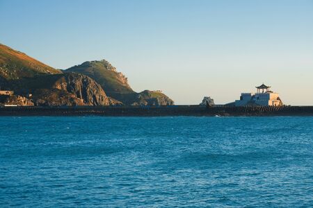 At dawn, the Ganen Pavilion rests on a causeway between Xiyin and Dongyin islands on the Matsu archipelago in Taiwan