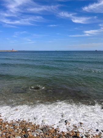 Coastline of the Mediterranean Sea with a lighthouse in the background