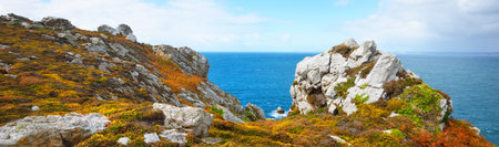 Rocky coast of France over the Atlantic Ocean, sea landscape. Pen hir in France.