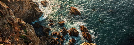 This aerial photograph captures the rocky surroundings of a body of water from above, showcasing the natural landscape, Panoramic aerial view of a rocky coastline meeting the sea, AI Generated