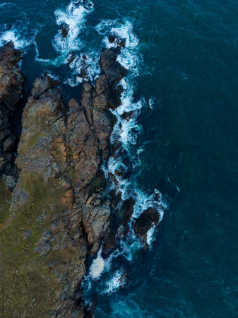 Aerial view of rugged coastal cliffs surrounded by deep blue ocean waves. The rocky formations are covered with green vegetation, creating a striking contrast against the water. The scene captures the beauty of nature and the power of the sea.