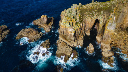Generative AI : Aerial view of Porthcurno beach along the coastline with cliffs and The Minack Theatre at sunset Cornwall United Kingdom