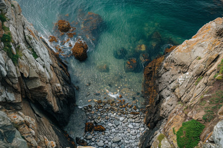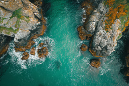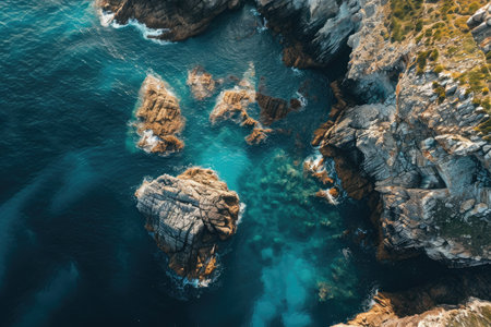 Aerial View of Body of Water Surrounded by Rocks, Stunning aerial perspective of sparkling sea and blooming seaweed on rocks, AI Generated