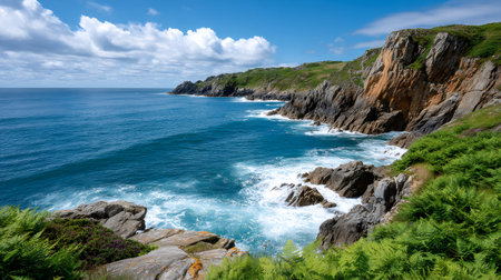 Rugged coastline with steep cliffs, rocks, and blue ocean waves under a summer sky