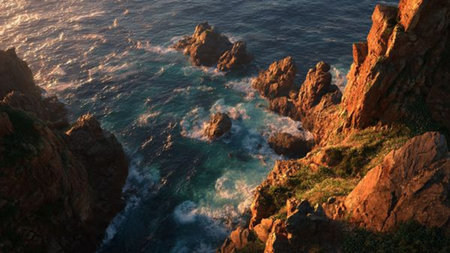The golden sun sets behind rugged cliffs, casting warm light on the crashing waves below, creating a tranquil and picturesque seaside atmosphere.