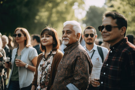 Rotterdam, Netherlands. June 29, 2019. Ijsvrij festival in a park. People are sitting, waiting for a ceremony to be start. Rear view, blur nature background.
