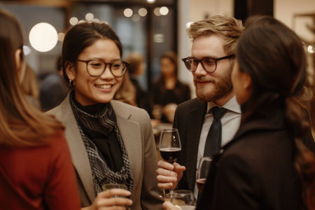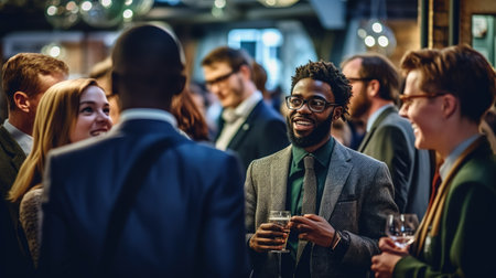 Business people networking at a corporate christmas party, mingling under warm string lights and savoring the festive atmosphere filled with joy and celebration during the holiday season