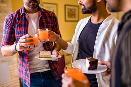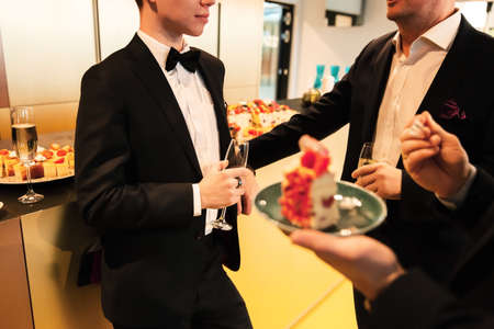 Three handsome men in suits drinking whiskey and communicating while spending time on party