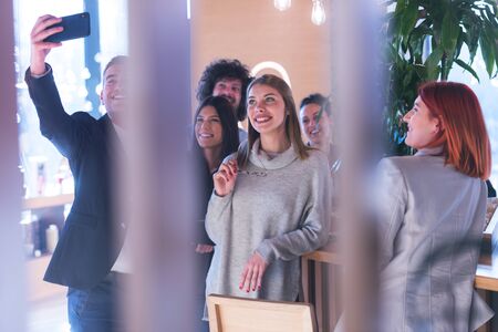 Group of happy young people taking photos with mobile phones and drinking coffee