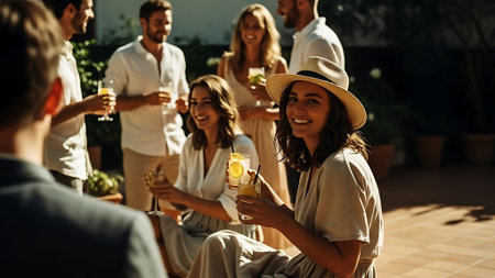 A vibrant summer gathering featuring friends enjoying food and drinks in a lush backyard. The scene captures joy, laughter, and connection in a lively outdoor setting.
