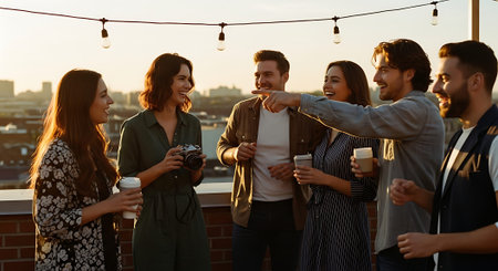 A group of young friends enjoying a rooftop gathering at sunset