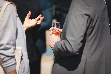 Businessmen texting on their mobile phones while holding beer glasses during an entrepreneurs event.