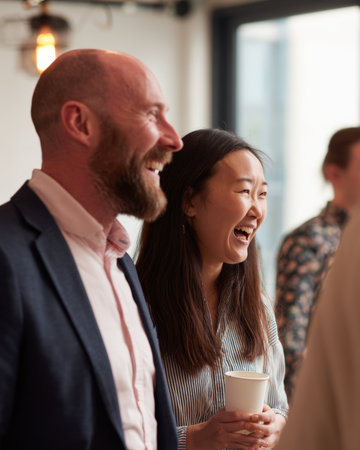 A corporate event with people networking and mingling. --ar 3:2 Job ID: 5a5bc1dc-4b1d-45b6-a71b-c48e18a010e6