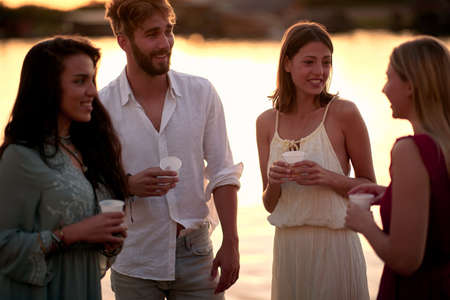 Smiling friends having party at evening - Happy people drinking and having fun.