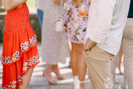 A bride with a wedding ring on her finger is holding a yellow plastic champagne glass. White dress. Bubbles of sparkling wine. Celebration.