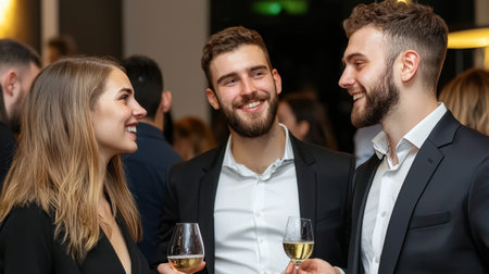 Professionals networking at a corporate event, engaged in conversation and holding drinks in a modern venue.