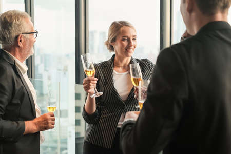 Group of business people clinking glasses with champagne in a modern office.
