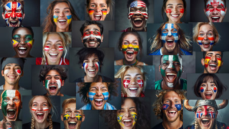 Multi National teams Fans with painted own country flags faces colors smiling laughing excited Roaring Supporting their favorite team straight at camera. Active sport fans movement and emotion collage