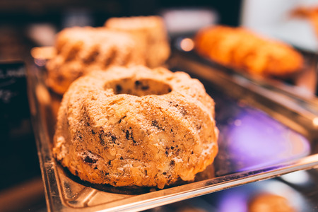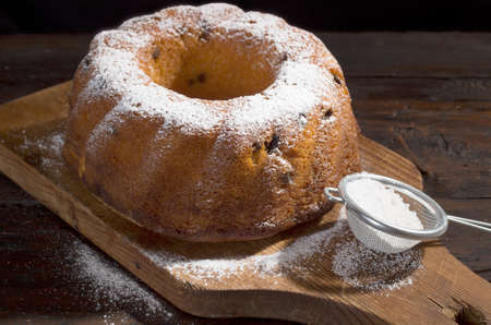 Homemade sponge cake with raisins dusted on a tray in bakery.